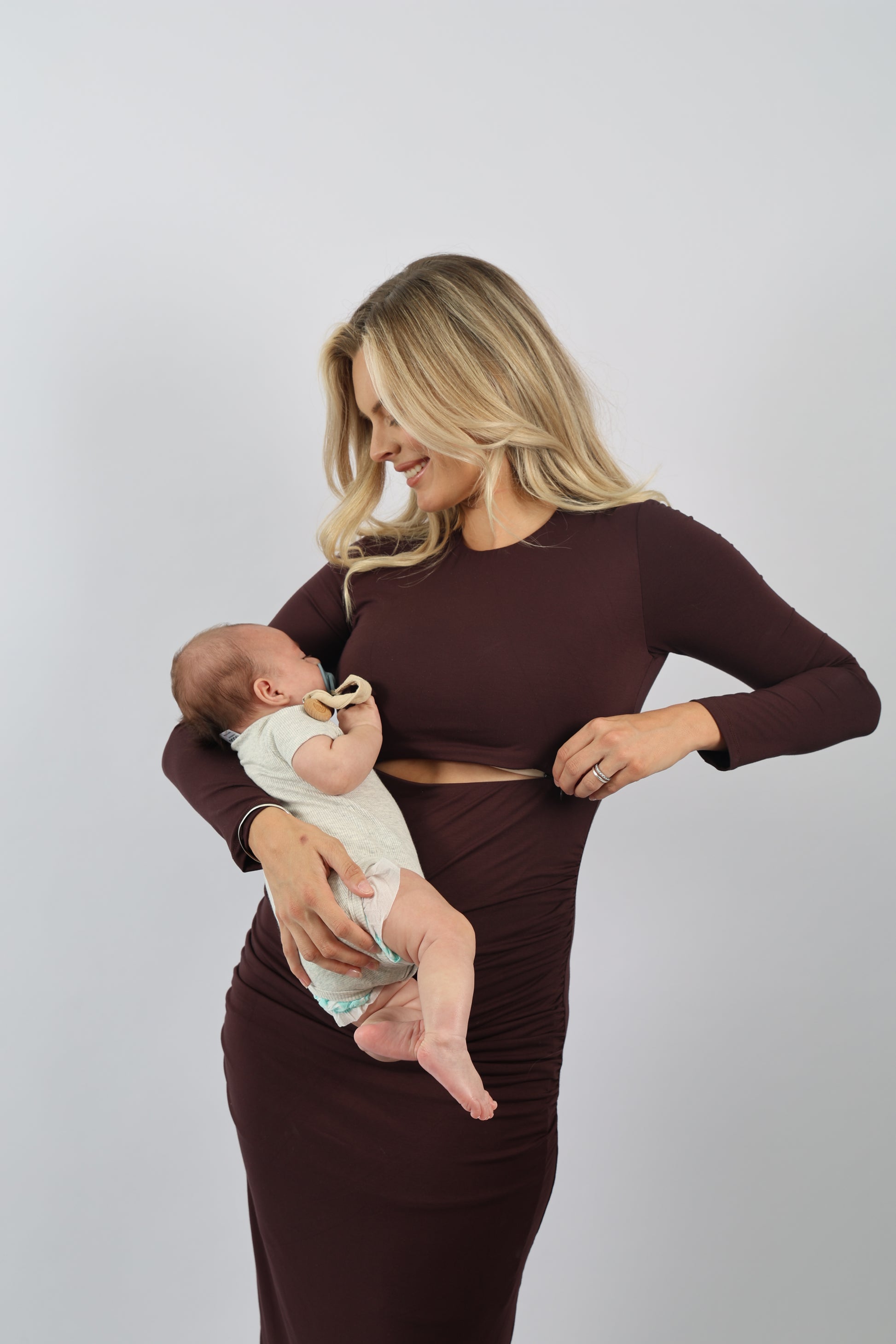 Luxuriously double lined with incredibly soft, breathable and comfortable bamboo fabric, our dresses are thoughtfully designed to take you through every stage of motherhood. Each piece includes an easily accessible double headed invisible zip for easy breastfeeding access on either side, gathered mid-section to stretch with your growing belly as well as create a flattering appearance post birth, built in compartments for bra pads/inserts for the option to go bra free. Easy to style up or down, it's a must have staple piece for your wardrobe!